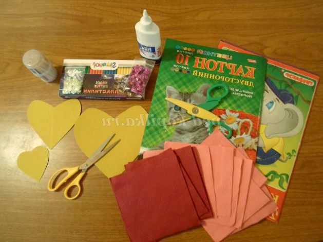 Для цього нам знадобиться: кольоровий картон (двосторонній), ножиці, кольорові серветки, клей, шаблони сердечок різної величини, пластилін, паєтки, самоклеющаяся папір, зубочистка або стрижень від ручки (це буде наша торцовочка). Я використовувала зубочистку з притупленим кінцем, інакше вона рве серветку.
