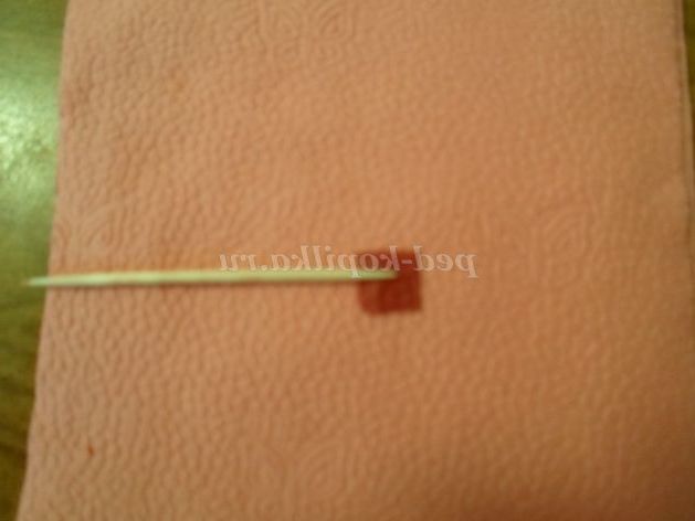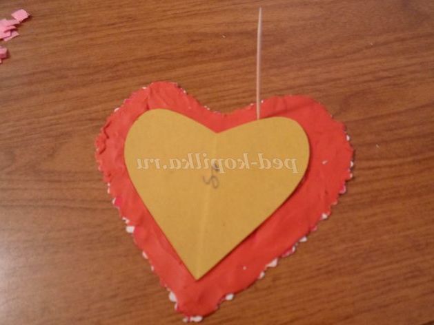 Беремо шаблон № 2, маємо його в центрі великого серця і обводимо зубочисткою. У нас виходить серце в сердце.Первым починаємо заповнювати менше сердечко.Ставим торцовочку на квадратик, як показано на фото. Сминаем серветку навколо торцювання, ущільнюючи знизу. Вставляємо нашу торцовочку в пластилін, придавлюємо і прибираємо торцювання. Таким чином, заповнюємо всю поверхню, щоб не було щілин.