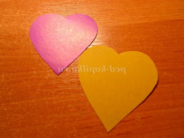 Потім складіть листок двостороннього картону навпіл, обведіть шаблон № 1 так, щоб при вирізанні верхня частина по лінії згину залишилася недоторканою. Вирізаємо сердечко. Я використовувала фігурні ножиці.