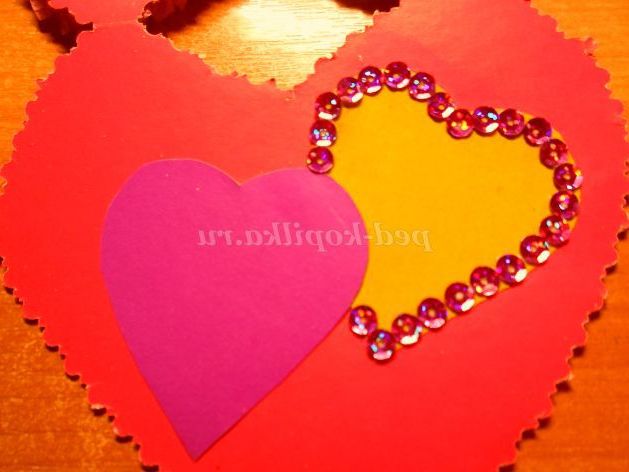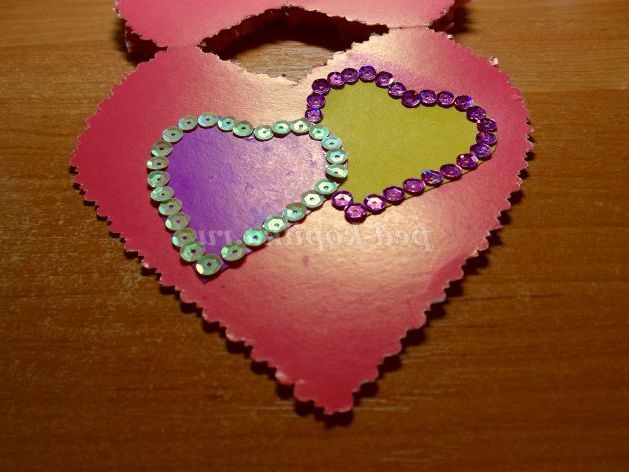 Потім відкриваємо листівку і оформляємо її всередині. Оформити її можна як завгодно. Я вирішила так: обвела шаблон № 3 на два різних за кольором листків картону, вирізала їх, наклеїла, прикрасила паєтками. Можна додати напис із самоклеючої плівки.