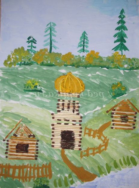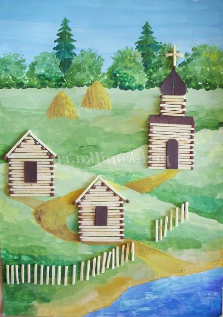 Фронтони хат викладаємо з обрізаних сірників. Дітям пропоную (на вибір) інший варіант: зафарбувати фронтони фарбою.