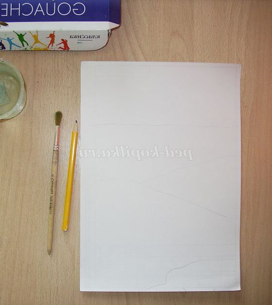 Виконаємо лінійний малюнок поділу простору: лінія горизонту, два пагорба, берег річки.