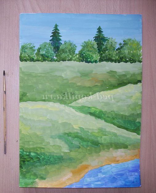 Також блакитним кольором малюємо річку, додаючи синіх відтінків.