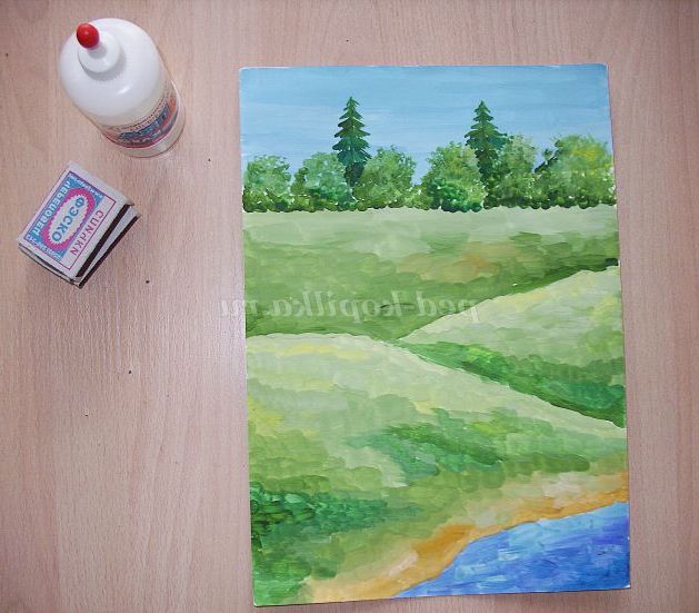 Обов'язково використовуємо переходи фарб: від темного до світлого. Листяні дерева можна виконати прийомом тычка.Хвойные дерева промальовуємо тонкою кистю.