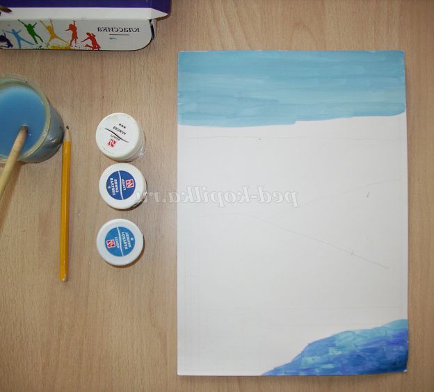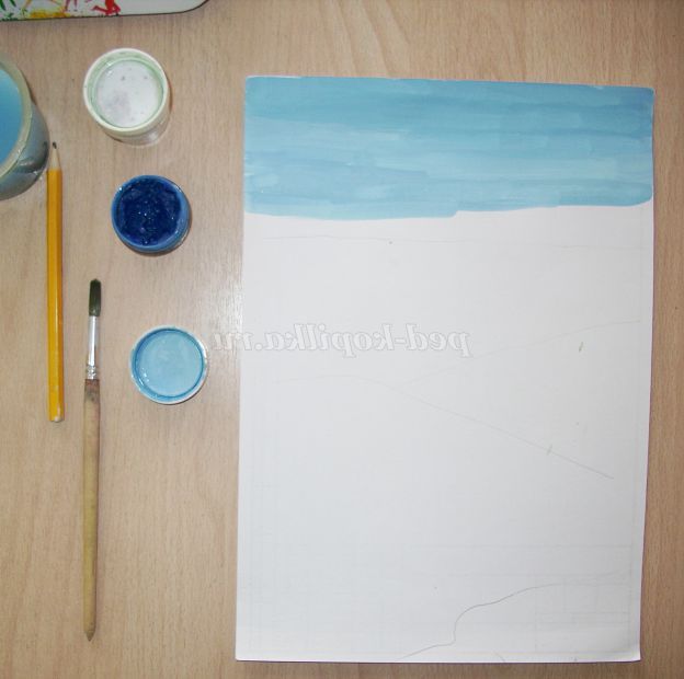 Приступаємо до розфарбовування фону. Візьмемо синю і білу фарби, змішаємо в кришечці, отриманому відтінком блакитного кольору малюємо небо.