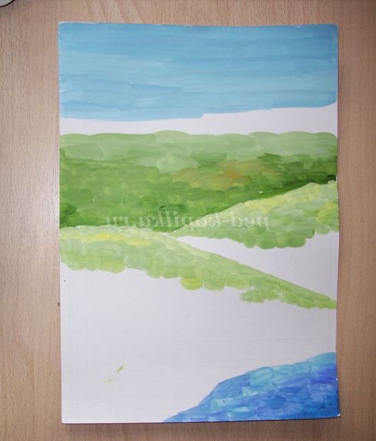Додамо в кришечку з білою фарбою трохи зеленої, перемішаємо. Додамо в кришечку з жовтою фарбою трохи зеленой.перемешаем. Отриманими відтінками зеленого кольору починаємо розфарбовувати землю.