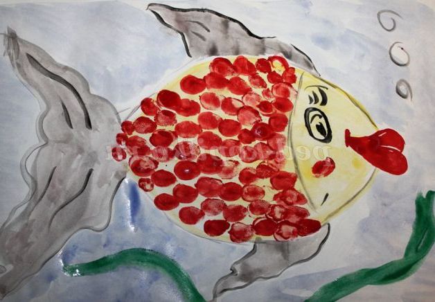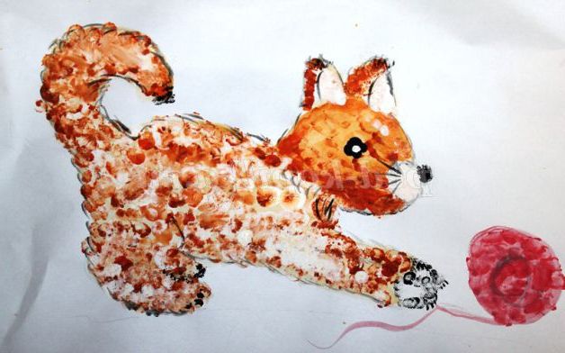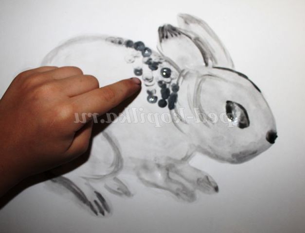 Спосіб отримання зображення: пензликом малюємо силует на папері, потім дитина опускає пальчик в гуаш і завдає точки, плями на силует. Після роботи пальчик витирається серветкою, потім гуаш легко стирається.