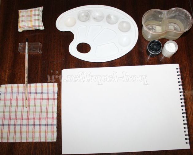 Матеріали: гуашеві фарби білого і чорного кольору, стаканчик з водою, пензлик, подушечка, серветка, аркуш білого паперу, палітра.