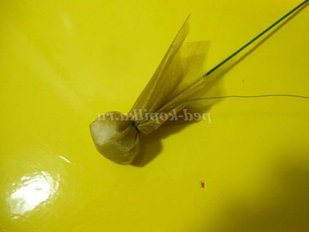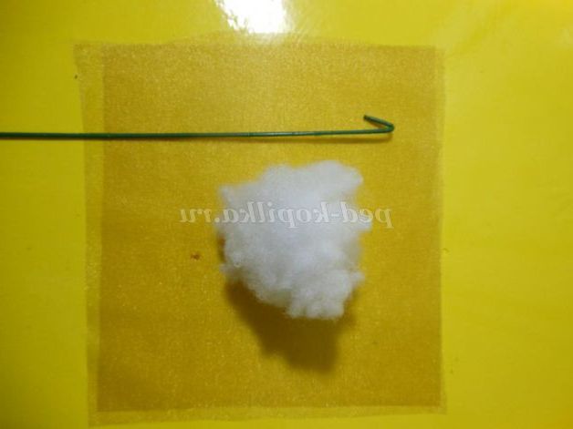Вставляємо дріт в основу синтепону прокручуємо, формуємо кульку обмотуємо органзою і закріплюємо дротом