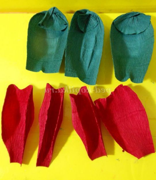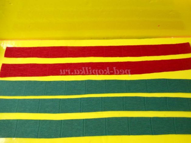 Крок шостий: робимо бутони, просто зелені і бутони з червоними нерозпустилися пелюстками, для цього нарізаємо смужки по довжині рулону і нарізаємо прямокутники 10х3