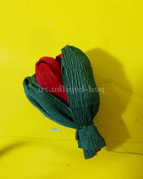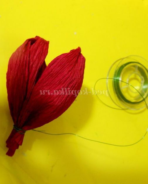 Тепер всі чотири пелюстки червоного кольору формуємо в бутон і фіксуємо дротом