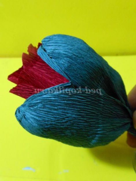 Нам знадобиться три прямокутника зеленого кольору 5х12 і червоного кольору 7х4.Вырезаем пелюстка вгорі заокруглюючи, а зелений прямокутник беремо в руки зверху 3см відраховуємо і перекручуємо, кінчик загинаємо всередину і вигинаємо зсередини, на фото це добре видно