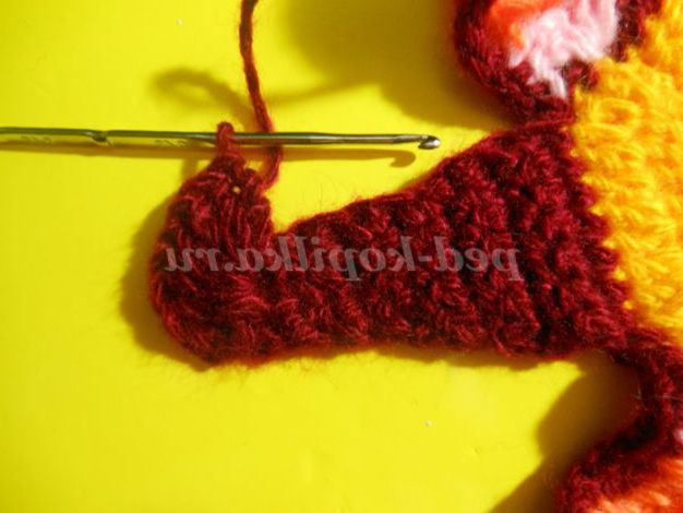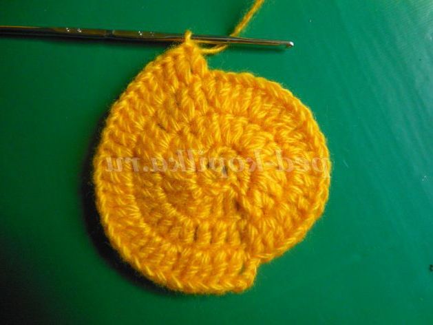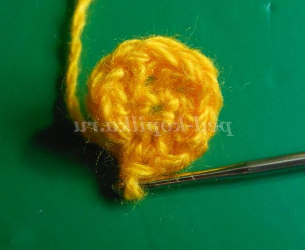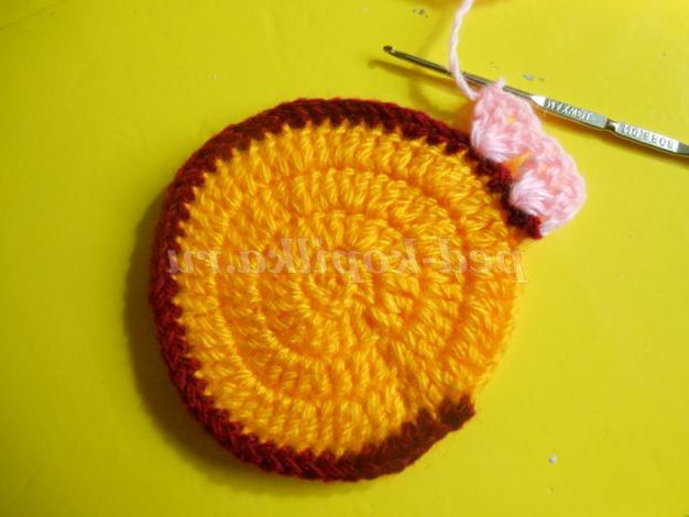 Далі контрастною ниткою пров'язуємо ряд СБН або полустолбиков, 8 петель залишаємо недовязанными, нитка обриваємо. Якщо тулуб ви плануєте в'язати цим же контрастним кольором, то нитка обривати не потрібно, а просто відсуньте поки моток в бік.