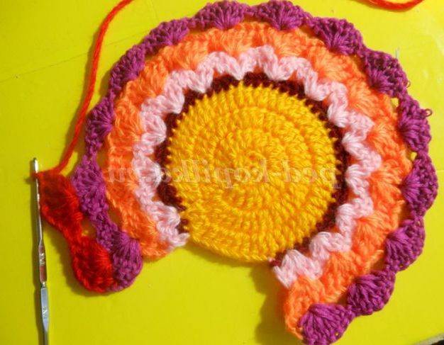 Ясно, що в кожному ряду кількість стовпчиків у кожному віялі треба збільшувати. Як бачите, тут теж немає точних цифр. Залежить від № гачка, товщини нитки. Прикладайте в'язання до плоскої поверхні і стежте, щоб не стягувалось і не фалдилось.Я в'язала гачком 2,5, ниткою середньої товщини.