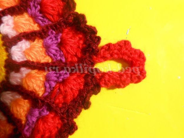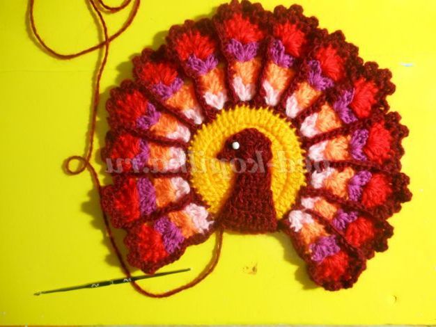 Тепер веерочками ССН в'яжемо хвост.Веерочков повинно бути незліченна количество.В цьому павліні у мене їх 15 штук. Для кожного кольору прикріплювала нову нитку з правого боку, роботу не перевертала. Віялами в'яжіть 4-5 рядів, не більше, інакше прихватки буде величезною.