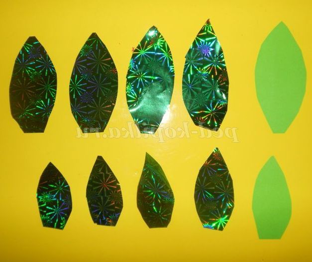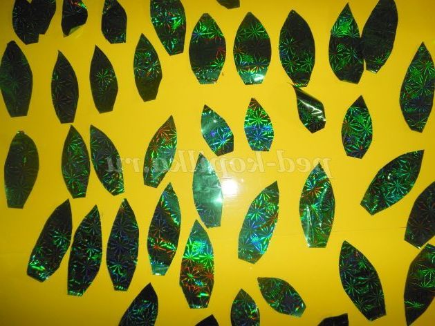 3. Далі листочки на ананас, матеріал може бути різноманітний, у мене під рукою опинилася клейова плівка, я нарізала на смуги, прибрала захисний папір і склеїла між собою