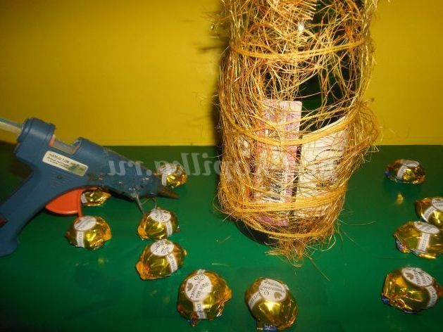 6. Далі декор самої пляшки, і так нам потрібні цукерки і клейовий пістолет