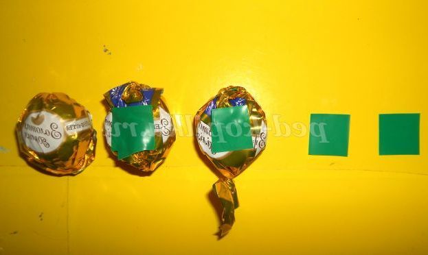 1. Починаємо підготовку цукерок, нам потрібно прибрати хвостики, я робила за допомогою ізоляційної стрічки, поясню відразу чому, кожну цукерку ми будемо приклеювати на гарячий клей, цукерка від температури терма клею може постраждати, а ізоляційна стрічка захистить нашу цукерку, придумала сама і це працює, цукерка залишається цілою і навіть не приховує. І так нарізаємо квадратики 1х1, спочатку клеїмо один хвостик, потім другим квадратиком другий хвостик
