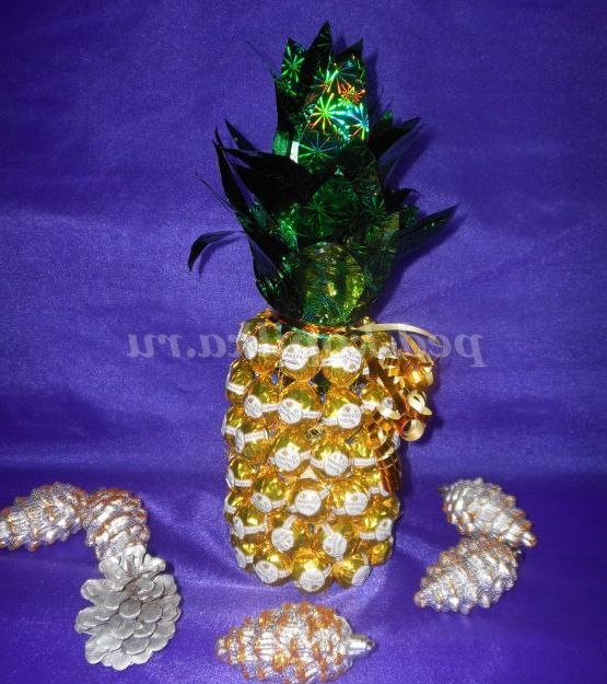 Вже через місяць новий рік. І вже стало традицією, що атрибутом новорічного столу є: пляшка шампанського, мандарини, цукерки і ананас. Ось такий солодкий ананас стане оригінальним і дуже незабутнім подарунком. Треба завжди радувати, незвичайними подарунками своїх друзів і близьких. Виглядає такий ананас дуже красиво і незвично.