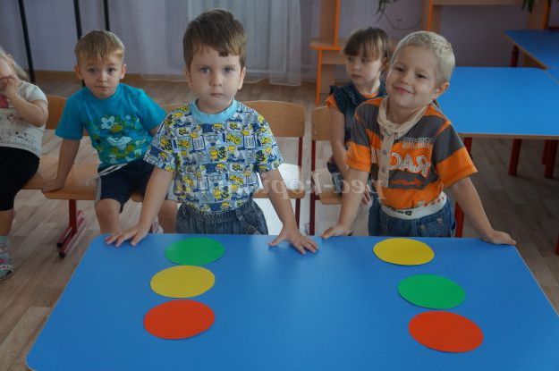(кожному з дітей лунає по три гуртки: зелений, жовтий і червоний)