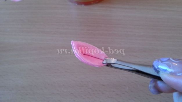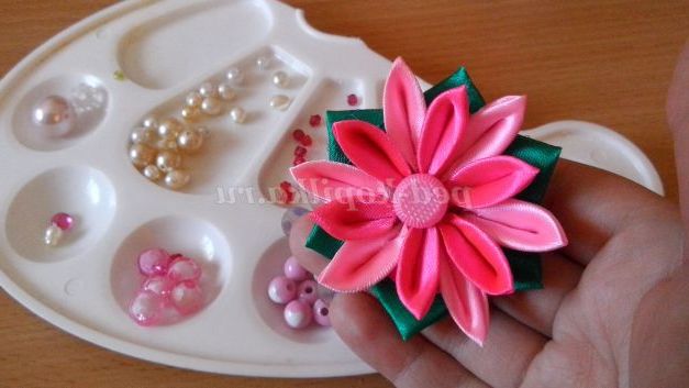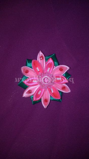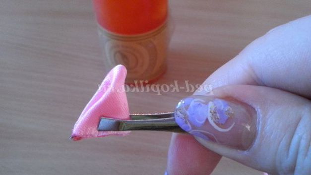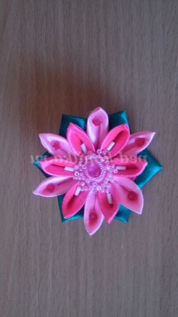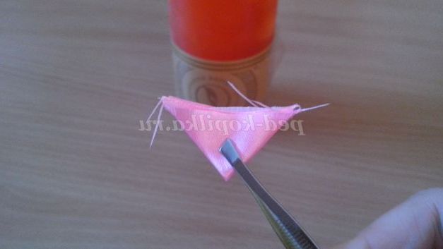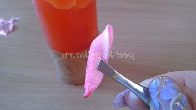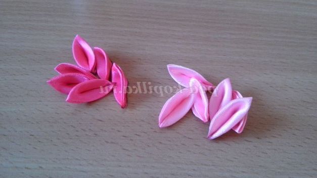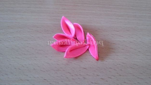 14)Аналогічно робимо 6 пелюсток з темно-рожевої стрічки.