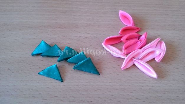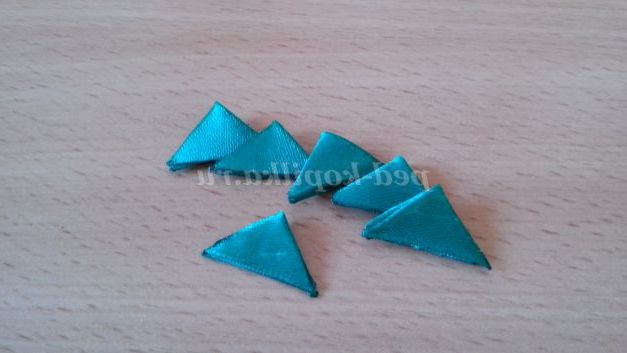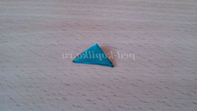 16)Приступаємо до виготовлення листочків. Беремо зелені квадратики і робимо кроки 6,7 і 8. У нас виходить трикутник.