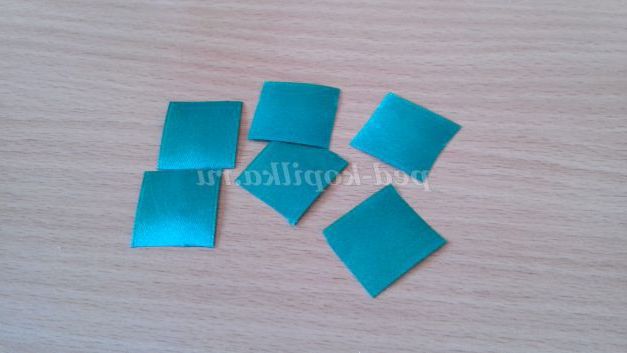 1)Беремо рожеві стрічки і відрізаємо квадрати 4х4 сантиметри. За 6 квадратів від кожної рожевої стрічки.
