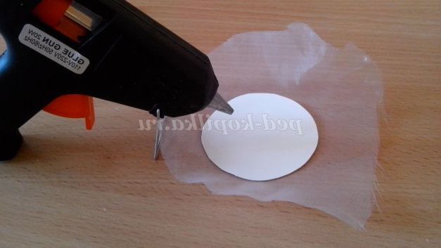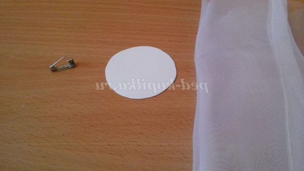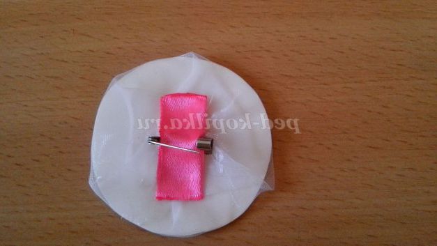 Обклеюємо коло оганзой, а ззаду за допомогою стрічки клею і фіксуємо шпильку.