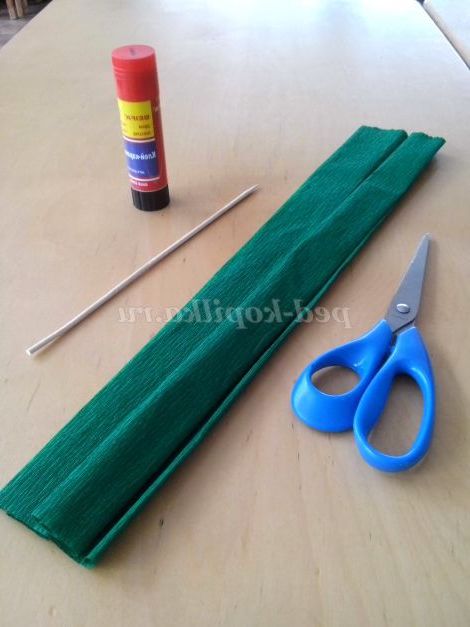 8) Починаємо виготовлення стебелька.Берем зелену папір,дерев'яну паличку і клей.