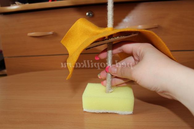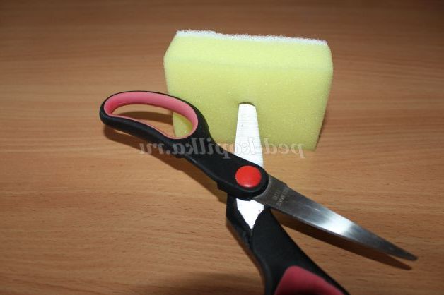 13)Беремо губку для миття посуду і по середині робимо дірочку.