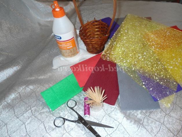 Матеріали: крепований папір фіолетового, сірого, бордового, червоного і зеленого кольорів, клей ПВА, ножиці, зубочистки, нитки звичайні;для оформлення: корзинка, сітка від букета квітів будь-якого кольору.