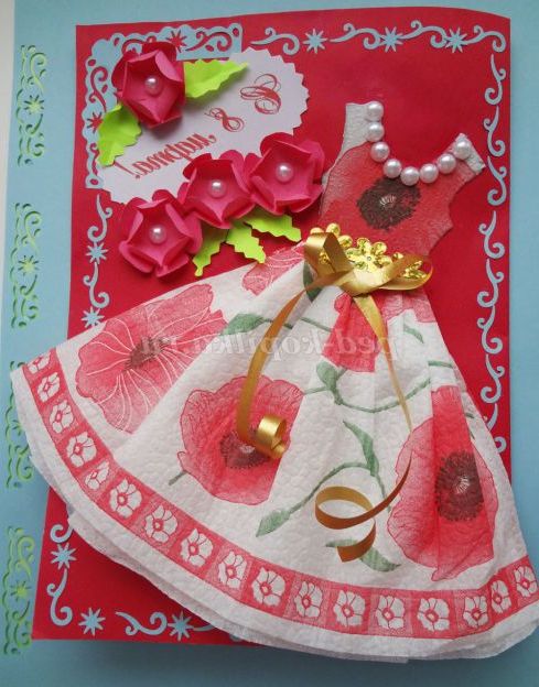 Наклеюємо на листівку. Прикрашаємо плаття напів-намистинами, паєтками. Складаємо папір рожевого кольору гармошкою, обводимо шаблон квіточки,