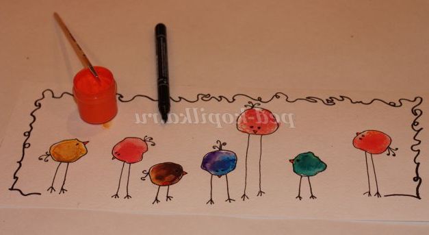Тепер найцікавіше! Вилуплюються курчата, а саме: малюємо контур. Оченята, ніжки, дзьобики. Не забудьте підфарбувати дзьоб тонким пензликом