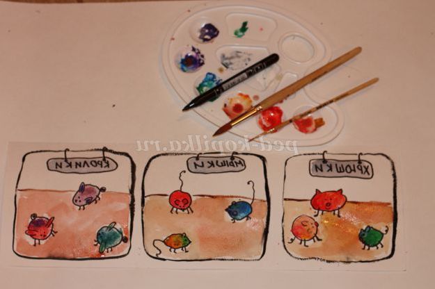 Нам потрібно гуаш або акварель, палітра (для змішування фарб), кисочки (велика для того що б брати фарби і мала для прорисовывания дрібних деталей), щільна папір і, звичайно ж, пробки. Пробок треба кілька штук, що б не мити багато разів