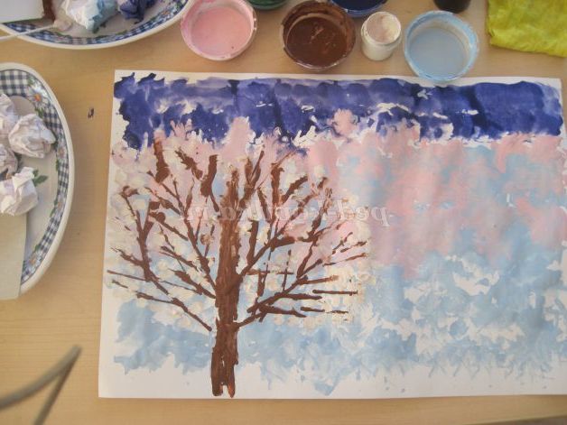 9. Чистою картонною смужкою малюємо проталинки біля дерева.