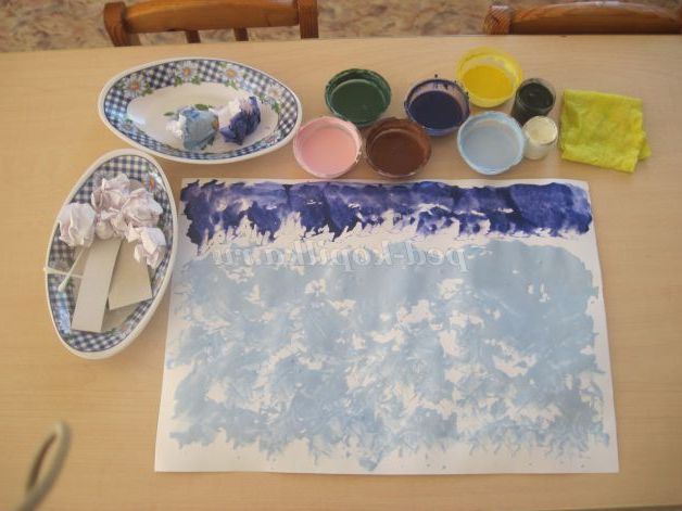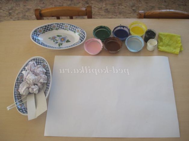 Матеріали для роботи: аркуш А3 або А4, паперові грудочки, 2 смужки картону, 2-3 ватяні палички, серветка для рук, 2 тарілочки під чисті і використані грудочки, розведена гуаш (синього, блакитного, жовтого, рожевого, коричневого. Гуаш чорного, білого, зеленого кольору можна поставити в баночках.