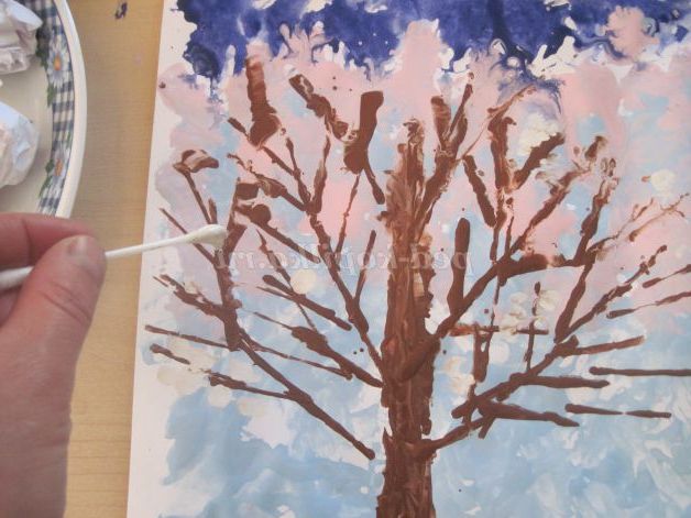 7. На ватяну паличку наносимо білу гуаш і малюємо квіти на гілочках дерева.