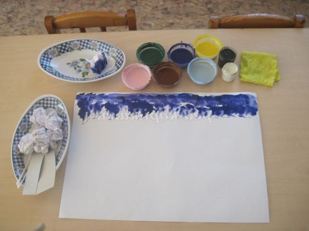 2. Беремо паперовий грудочку і занурюємо його з гуаш синього кольору, малюємо верхню межу неба, промаківая лист.