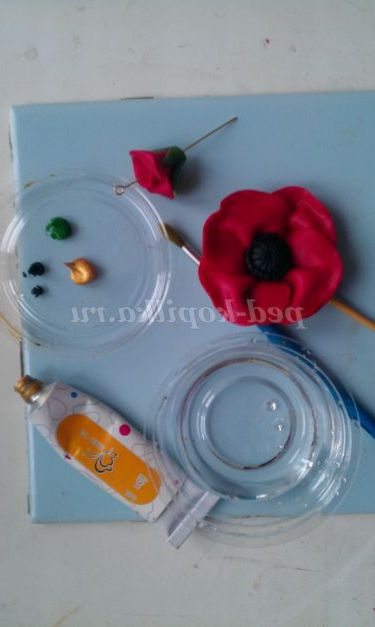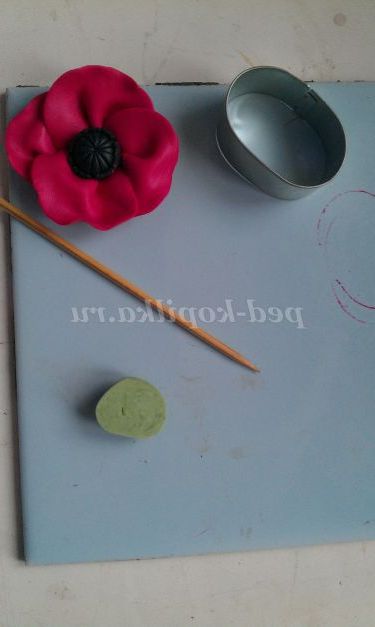 9 крок. Зліпимо маленький бутончик маку для оформлення підвіски. Прикріпимо на нього теж зелений листок. Протягнемо через бутон пін і відправляємо запікатися в грубку. Потім, вийнявши запечені квіти, охладим їх у кухоль з холодною водою. І приступимо до фарбування.