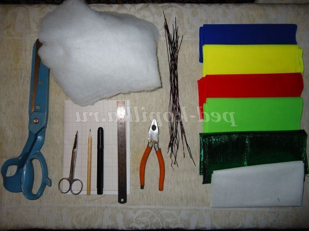 1. Шматочки трикотажу яскравих кольорів (в даному випадку салатовий, червоний, жовтий, синій)