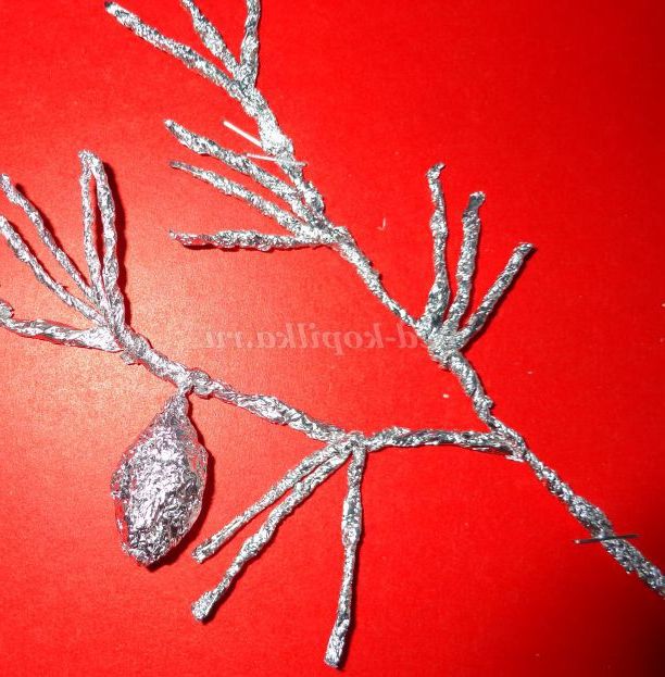 Беремо смужки фольги шириною 1,5-2 див. Ретельно розрівняти дріт і розгладити фольгу. Зробити кілька щільних витків, міцно приживая їх пальцями. Коли фольга перестане ковзати навколо провоки, можна пальцями однієї руки обертати дріт, а інший - направляти смужку фольги. Аналогічно можна намотати на шнур або паперовий шпагат.