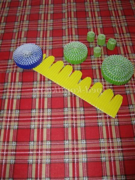 на картоні відміряємо лінійкою мітки по 1 сантиметру і малюємо смужки, потім нарізаємо акуратно ножицями (смужки нарізаємо заздалегідь, можна кілька смужок дати нарізати самим дітям. З жовтого гофрованого картону вирізаємо пелюстки для квіточки.