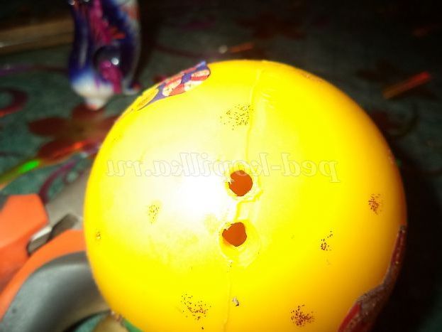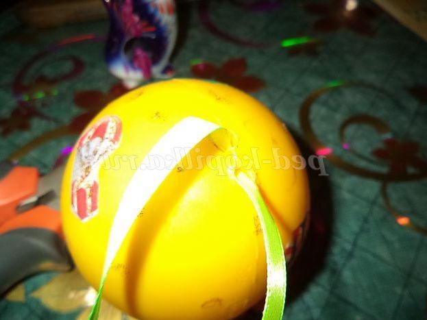 6. Залишилося зовсім небагато. Робимо отвори в нашому кулі за допомогою розпеченого цвяха, але можна, і просвердлити дрилем. Вставляємо стрічку або нитку декоративну. Покриваємо виріб акриловим лаком, сушимо в підвішеному стані.