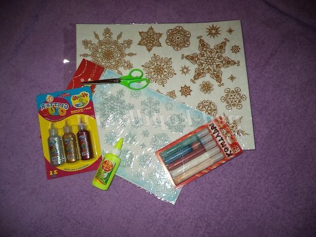 5. Беремо кольорові контури, гелі, акрилові фарби, клей з блискітками. Починаємо виділяти малюнок (фрагмент малюнка), на свій розсуд. Фарбований малюнок сушимо від двох до шести годин, при кімнатній температурі. Якщо не хочете довго чекати, використовуйте наклейки з новорічною тематикою;