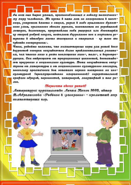Отже, давайте пам'ятати, що комп'ютерні ігри для дітей всіх віків сьогодні виявляються більш привабливим заняттям, ніж читання книг і навіть поглащение кіно-, теле-і відеопродукції. Вони відвертають від традиційних цінностей, виховують презирство до національно культурі. Діти стають відчужені від літератури і від національної культурної спадщини, оскільки практично вся естетика екрану побудована на инокультурной (переважно американської) змістовної графіку образів, персонажів, інтер'єрів, ландшафтів і так далі.