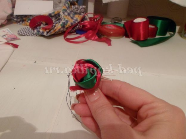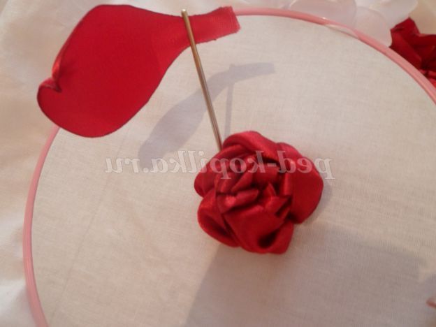 На цьому можна б і закінчити, але я пропоную додати до нашого бутон квітки. Для цього потрібно зі стрічки 5 див.,Вирізати 8 квадратів. Складаємо квадрати по діагоналі, повертаємо вийшов трикутник прямим кутом до себе. Беремо голку з ниткою і починаємо крайню сторону на голку маленькими стібками. Доходимо до прямого кута, до незібраною стороні прикладаємо наступний трикутник і продовжуємо збирати. Таким чином, ми збираємо на одну нитку всі наші квадрати.