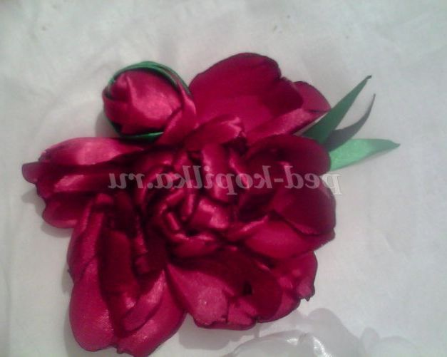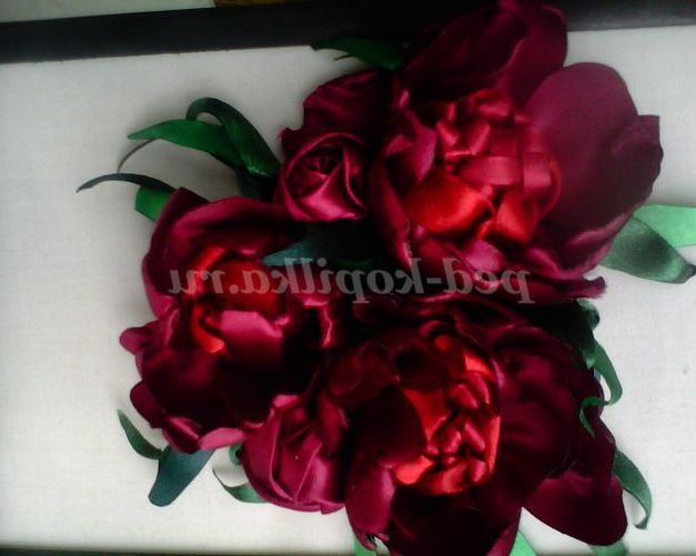 А я пропоную створити букет півоній за допомогою голки і атласних стрічок. Для роботи нам знадобитися:атласні Стрічки, шириною 5 см,2,5 см,0,5 див., для пелюсток, одного кольору. Для листочків зеленого кольору, 2-3 тони. Голки з широким вушком, ножиці, п'яльця, тканина для основи, нитки для шиття,запальничка або свічка.