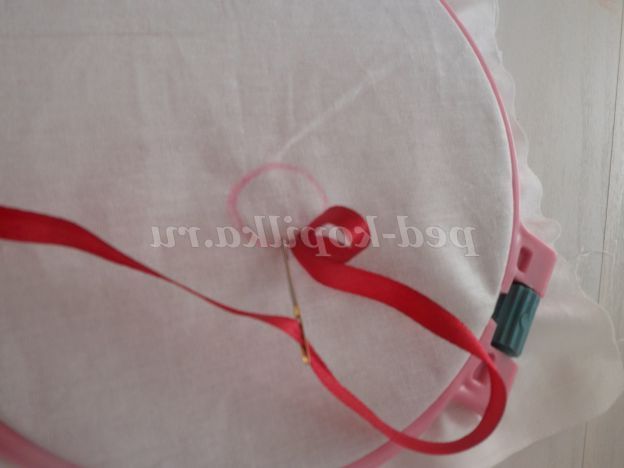 На основі малюємо серединку квітки. заправляємо стрічку 0,5 див. в голку. Починаємо роботу з виворітного боку, виводимо голку на лицьову витягуємо стрічку,слідкуємо щоб кінець стрічки з вивороту нікуди не втік. Вколюємо голку на лицьовій стороні поруч з виходом стрічки. Протягуємо стрічку на виворітну сторону залишаючи петлю близько 1 див. Таким чином заповнюємо всю серединку квітки.