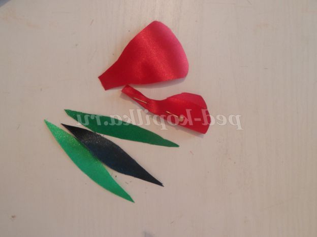 Для листочків, з зеленої стрічки вирізаємо смужки з гострими кінчиками.