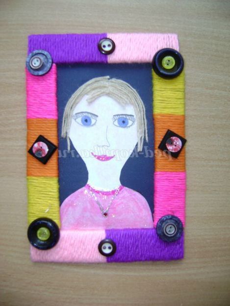 Оформлення зачіски: приклеюємо клеєм ПВА пряжу на голову /колір пряжі збігається з кольором маминих волосся/.